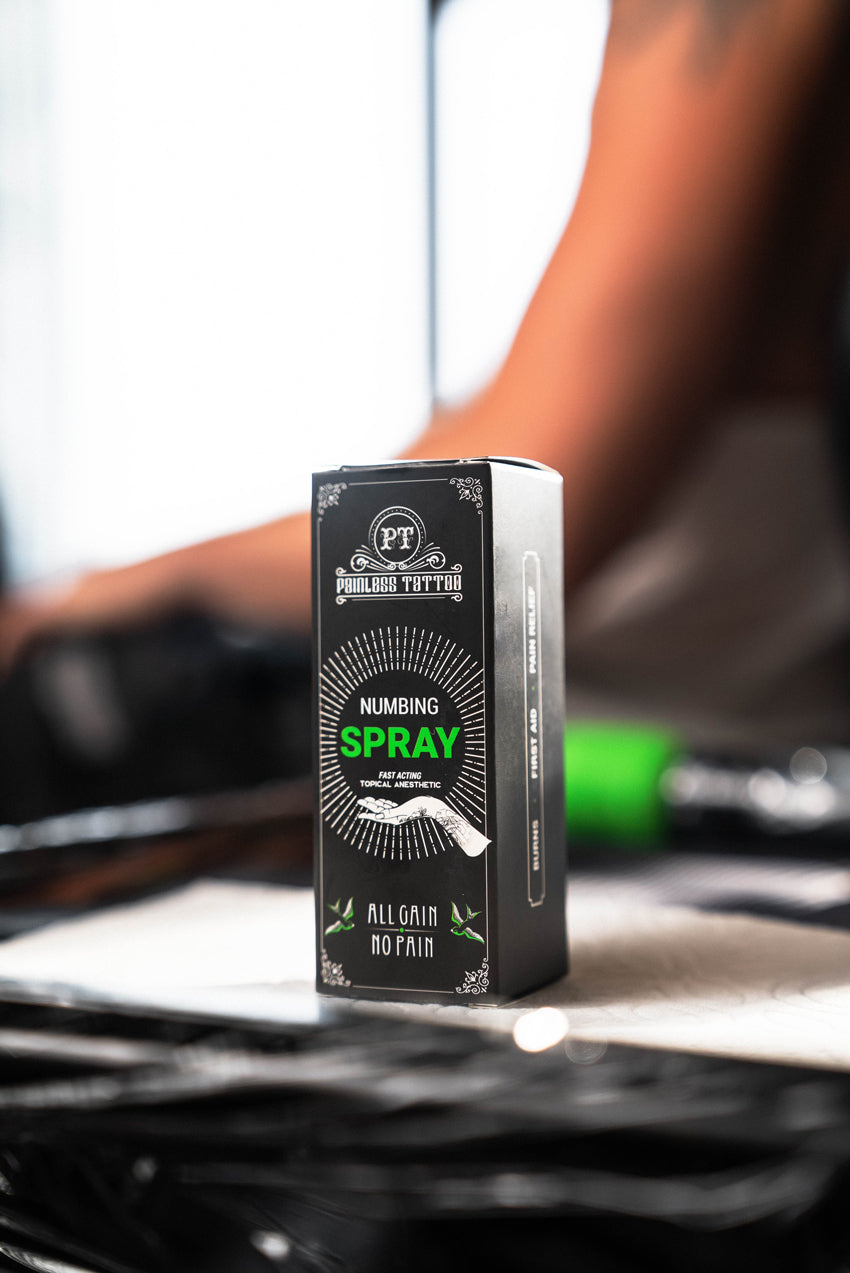 MAX PAIN RELIEF The proprietary formulation of Painless Tattoo™ Numbing Spray includes both skin conditioners and compounds added to improve absorption and efficacy.